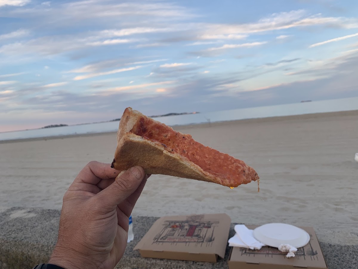 Simply the best pizza in all of New England. This place and it's been putting out quality pies for decades. No frills here, just incredibly great thin crust pizza, no toppings sold here. If you order two slices it will equal half a pizza. Enormous sized slices, with the best crust around. Hands down my favorite pizza of all time
